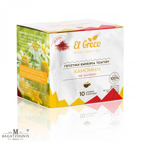 Γευστικό και ευεργετικό χαμομήλι με Saffron, που συνδυάζονται άψογα δημιουργώντας ένα ήπιο, απολαυστικό, φυσικό ρόφημα για όλες τις ώρες της ημέρας. Απολαύστε το ζεστό ή κρύο. Προτιμήστε το με προσθήκη μελιού.