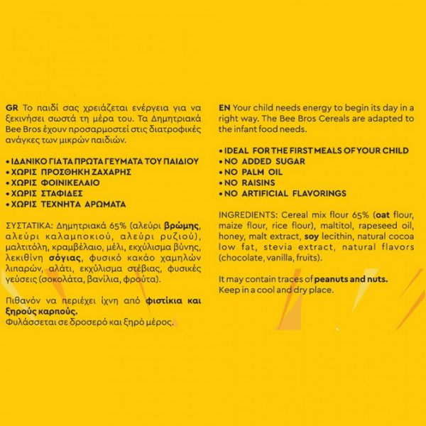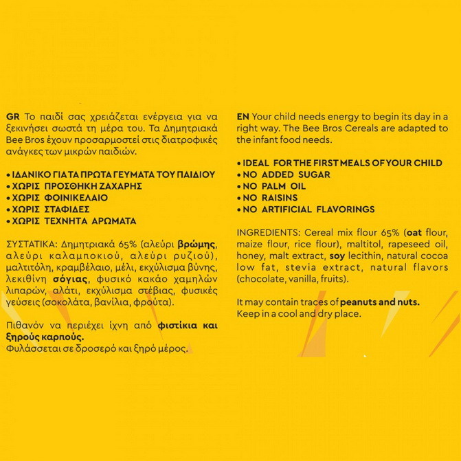 Το παιδί σας χρειάζεται ενέργεια για να ξεκινήσει σωστά την ημέρα του. Τα παιδικά δημητριακά The Bee Bros έχουν προσαρμοστεί στις διατροφικές ανάγκες των μικρών παιδιών.